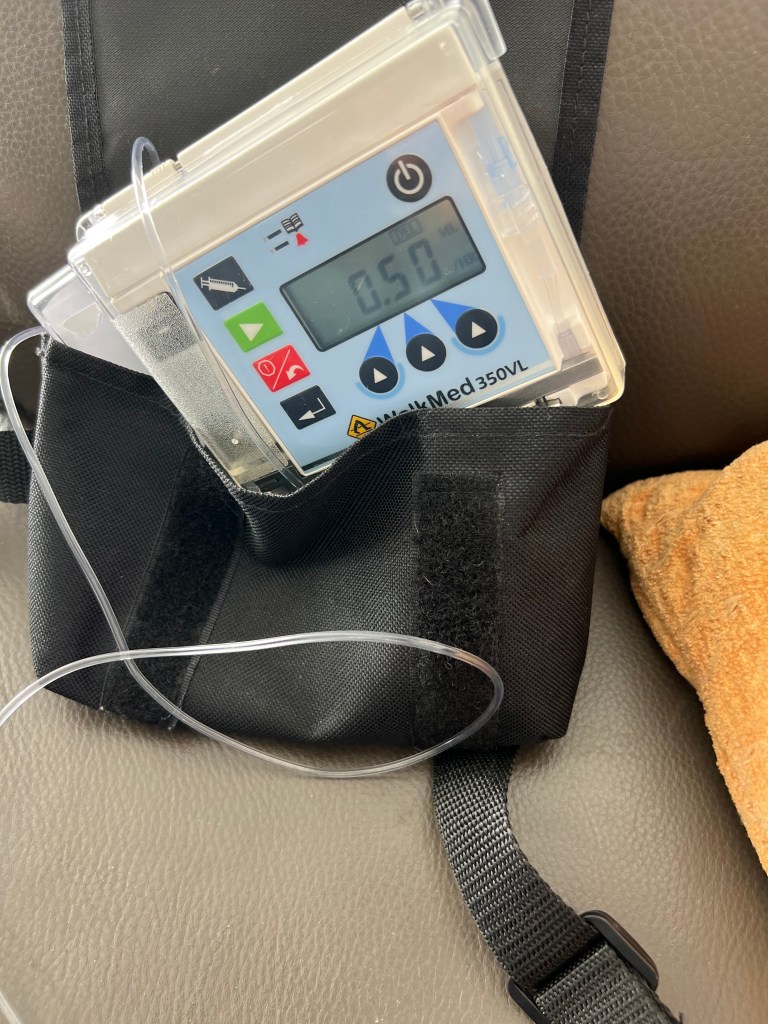 This is my “fashionable” fanny pack with my Chemo box in it. I wear it for three days for slow release for a total of 46 hours as it delivers 1.78 mL an hour.