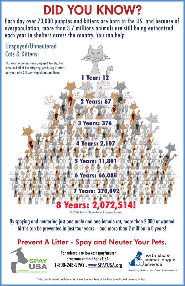 I had lunch with my friend Sue, who you should be very familiar with by now lol. We are helping Lindalee from all Kitty Korner write a grant from Petsmart Charity. I love Sue dearly, but she’s a disaster on the computer and has managed to get us locked out of the website so first order of business is to figure out how to undo her good intentions :-). All Kitty Korner has been working in our area since 2004 and has made a huge difference in the community cat population. Sadly, lindalee finds cats who are very friendly and adoptable but have been thrown away by their owners and are living in these colonies or on the streets.. Happily, she takes these cats in along with their kittens and gets them the medical treatment they need including sterilization. She takes them to Petsmart to get them adopted. Last year she did 192 adoptions through Petsmart! If you’re not familiar with the problem of unsterilized pets and unsterilized animals living outdoors, check out the numbers below. Unfortunately, sometimes animal rescue feels overwhelming. I compare it to trying to make a difference by taking one grain of sand off the beach. Fortunately, people in Rescue know that each and every life is precious and if we can make a difference in one animals’ life, it’s worth the effort :-).