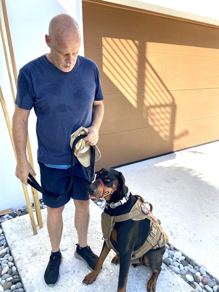 This morning Baxter had another training session with Trish from Dawg Phonics. Hans and I told her we did not feel comfortable using the shock collar, and because we weren’t using it consistently she agreed to put it to the side. We worked on heel and sit with Baxter. The challenge was that Trisha’s service dog, Athena, was present. At first, Baxter could not keep his eyes off of her and was not concentrating, so Trish introduced the gentle leader. It is not a muzzle, but it does control the dog’s head, and it made an amazing difference. By the end of our session, he was healing like a champ and completely ignoring Athena 🙂 now it’s up to us to practice practice practice.