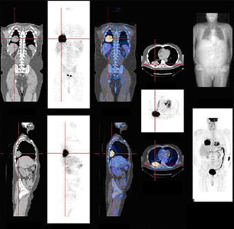 A PET scan is a test that creates 3 dimensional (3D) pictures of the inside of your body. PET stands for positron emission tomography. The PET scan uses a mildly radioactive drug to show up areas of your body where cells are more active than normal and makes a picture of where glucose is being used in the brain. Malignant tumor cells show up brighter in the picture because they are more active and take up more glucose than normal cells.