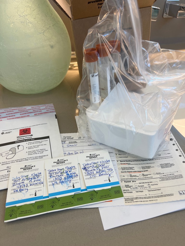 The kit also contained 3 plastic tubes (2 with liquid and 1 without liquid), disposable nitrile gloves, a triple slide test card with applicator sticks, a tube rack, an absorbent pad to lay on a sturdy surface, an envelope for the test card and the above stool sample questionnaire. TMI? Probably, so I’ll skip the collection details. Bottom line is that I have done my civic “doody” (sorry, I can’t help myself) and will Fed Ex the “shit and Caboodle” tomorrow.