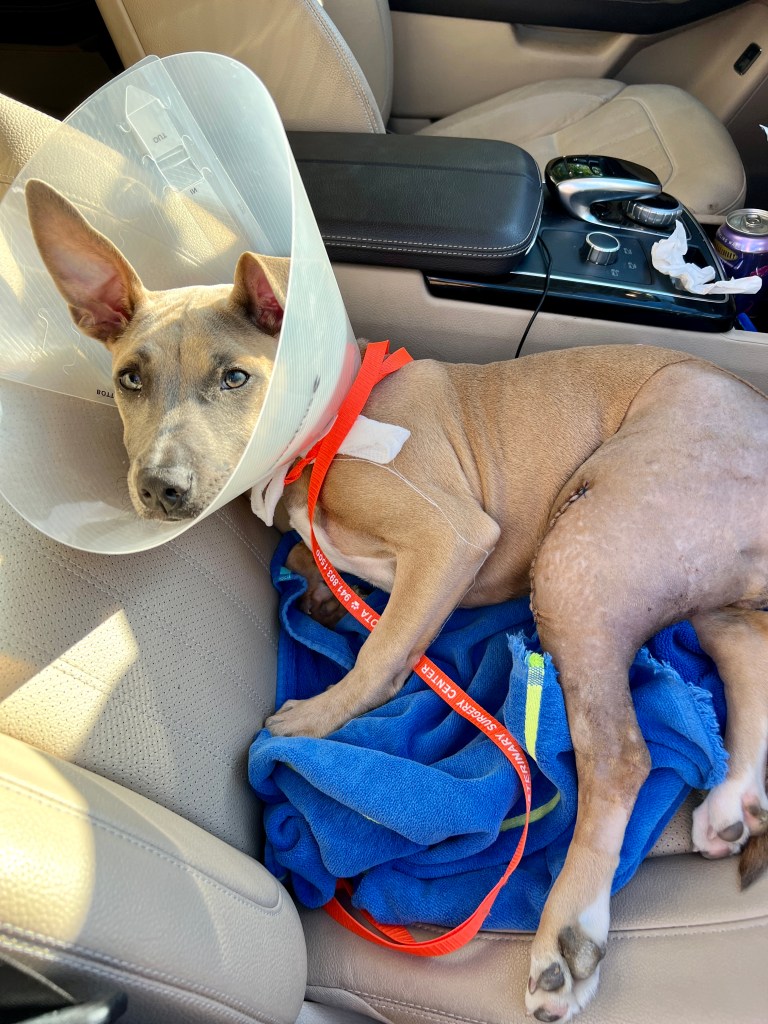 After playgroup, it was time to grab Momma cat and kittens and head to Bishop. Momma was deemed adoptable and will be spayed tomorrow and then join the adoptable cats at Kitty Town. The 3 kittens got their shots and are happily back home with me as is our favorite Limpy Lou, Delilah. Although she was heavily drugged from her intense surgery, Delilah still managed to give me kisses and wags from the moment we saw each other. She has a long row of stitches and is wearing a cone to prevent her from messing with them. Her other leg has a fracture but she manages to walk ok. Now the game is to keep her medicated and let her heal. I have 5 different meds to be given at 5 different times during the day/night so I need to be on my game. I also was given a gel pack to put in the freezer and apply to the stitches at 5 minute intervals to prevent swelling.
