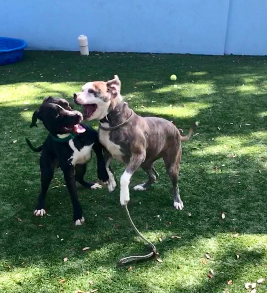 Loni is the “new generation” of volunteers and very dedicated. She is tackling many different roles at the Shelter, including dog walker, trainer and now playgroup. One of the fun parts of getting older is watching and mentoring the people who will take on your former roles. Fellow volunteer Benita and I ran playgroup for years until Covid shut it down. Loni and Caroline are starting it back up and Loni asked me to come by for a “consult.” I was instantly transported back in time when Benita and I first started working with the dogs. This was before the turf was installed and we played with the pups in dirt while dodging tree roots and freshly dug holes. It’s amazing we weren’t injured.