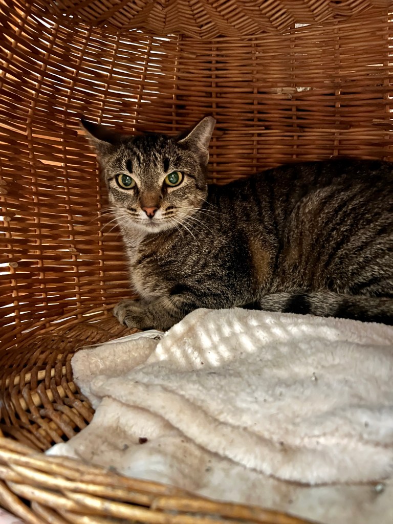 On a final note…my empty catio was filled today. Sue came in with 2 sister cats who were living outdoors but are friendly. There was no place for them to land until Sunday. Luckily, I had room and the two girls are settling in. As you see from her pinned back ears, the transition may take time. I’m sure it’s very confusing to be thrust into a new environment. I hope to have them feeling secure and purring soon…..