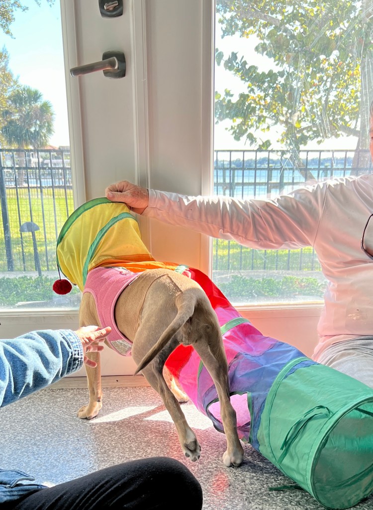 Shortly after Becky and Diane left, some friends came over to meet Delilah. They lost their dog earlier in the year and are looking to adopt at some point. The meet and greet went well, with Delilah being her usual, loving self. Actually, she was quite goofy, and kept sticking her head in the cat tunnel and running around with the tunnel as if it was a fashion accessory