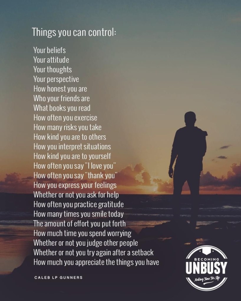 The afternoon was uneventful save for the still unexplained pain. I spent the rest of the day on my rear end again! I’m sensing a pattern here. Mornings ok…downhill from there. For now, it’s mostly out of my control. I think I will adopt the list below as my mantra.