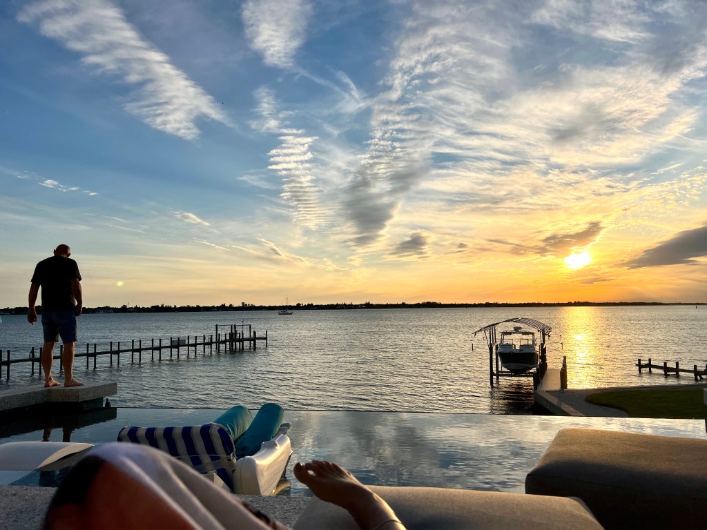 Hans just woke up and saw me typing away on my phone. Write about last night he suggested. About sitting outside and appreciating the perfect temperature…the orange sunset…watching the manatee come up for air at 2 minute intervals (Hans timed him and was amazed at his consistency)…about being chased inside when the blood suckers came calling.